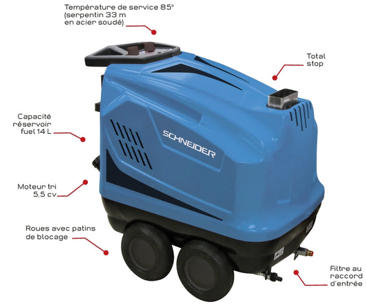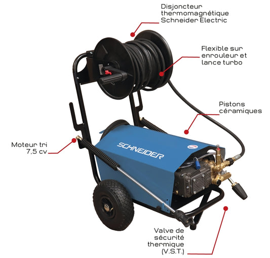 Nettoyeur HP eau chaude 380V 14 l/min 160 bar avec flexible 15m et total stop
